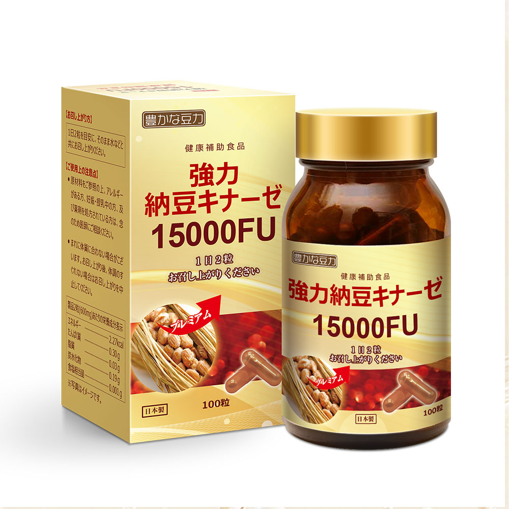 ナットウキナーゼ含有ナットウ粉末(国内製造)/ゼラチン、結晶セルロース、カラメル色素、二酸化ケイ素、ステアリン酸マグネシウム、(一部に大豆・ゼラチンを含む)